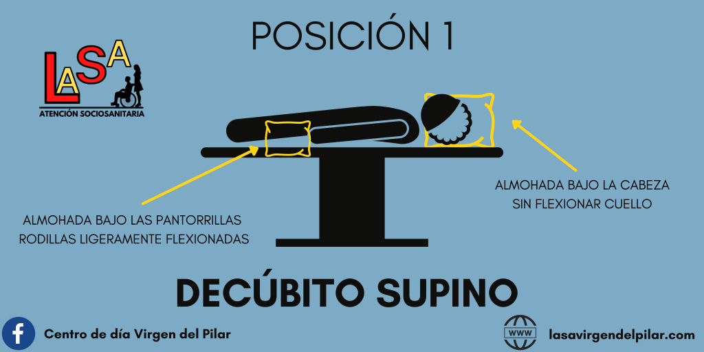 En esta posición la persona es colocada boca arriba, con una almohada bajo la cabeza (sin flexionar el cuello) y otra bajo las pantorrillas, para evitar que las piernas se apoyen sobre un punto concreto (así evitamos zonas de presión).