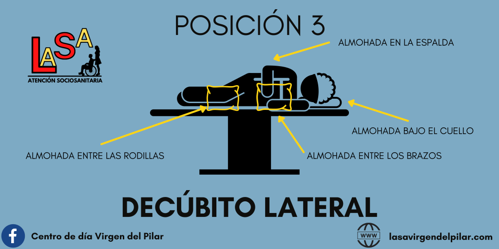 Utilizaremos una tercera almohada colocada entre las rodillas para evitar rozamientos, dejando flexionada aquella pierna que no descansa sobre la cama. Una última almohada será colocada en la espalda de la persona dependiente, para evitar que se caiga hacia ese lado.
