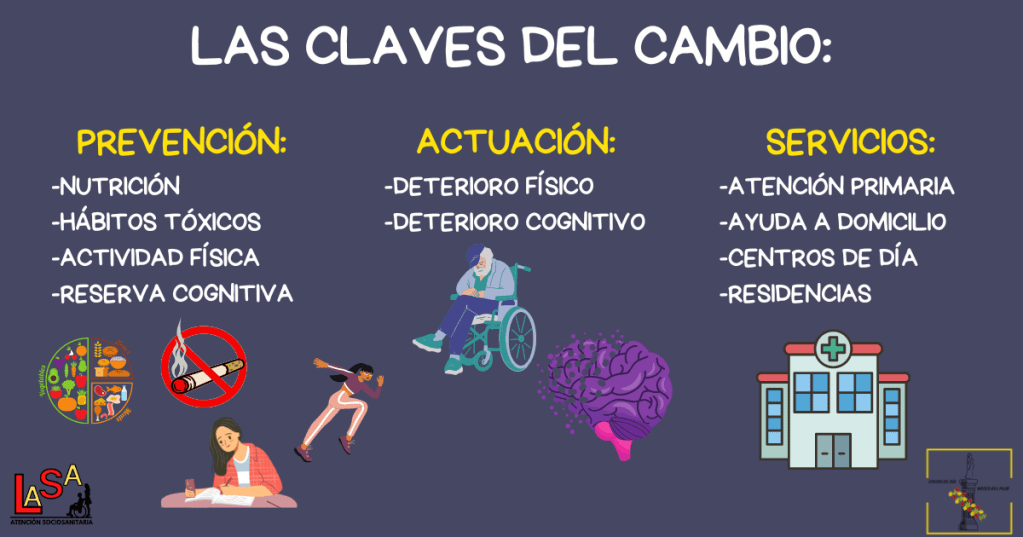 Para ejercer un cambio de paradigma debemos en primer lugar poner en valor todo lo relacionado con la prevención de los problemas más comunes que surgen con el envejecimiento: el deterioro físico (dolores articulares, pérdida de masa muscular) y cognitivo (pérdida de memoria a corto plazo, problemas con el lenguaje y el razonamiento). Factores como la nutrición, el nivel de actividad física y mental (reserva cognitiva), unidos a la ausencia de hábitos tóxicos y una buena atención primaria en sanidad, son claves. Junto a todos ellos, también debe primar la existencia de instituciones proveedoras de servicios sociales, que actúen como escudo para la prevención, y de manera terapéutica, cuando ya se presentan estos factores. Residencias, centros de día, servicios domiciliarios, que deben, por un lado, ofrecer servicios y atención de calidad, con programas enfocados en el envejecimiento activo, y por el otro lado, deben ser apoyados desde la Administración Pública, ya que sólo así, entre la colaboración publico-privada, seremos capaces de llegar a ofertas las suficientes plazas, y con la suficiente calidad, para abordar todos los retos que se nos presentan en las próximas décadas, en las que la generación del «baby boom», encarrila la jubilación.